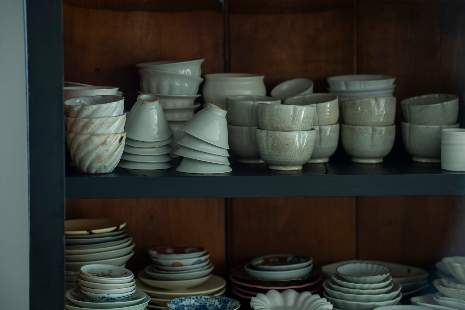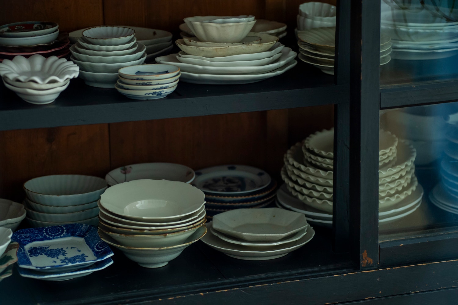 前回に引き続き雅姫さんの食器棚のおはなし。今回はこれまで雑誌などでもたびたび紹介されているダイニングのシンボル的存在、ふたつの黒い棚についてうかがいました。ひとつは、大きく存在感のある水屋箪笥。もうひとつは、ガラス扉の美しいショーケースです。どちらも、雅姫さんの日々の暮らしを支える器たちを、使うために、飾るために、そして楽しために、欠かすことのできない大切な場所になっています。それぞれの棚に込められた思い、そして器たちとの静かな時間について、ゆっくりとご案内していきます。