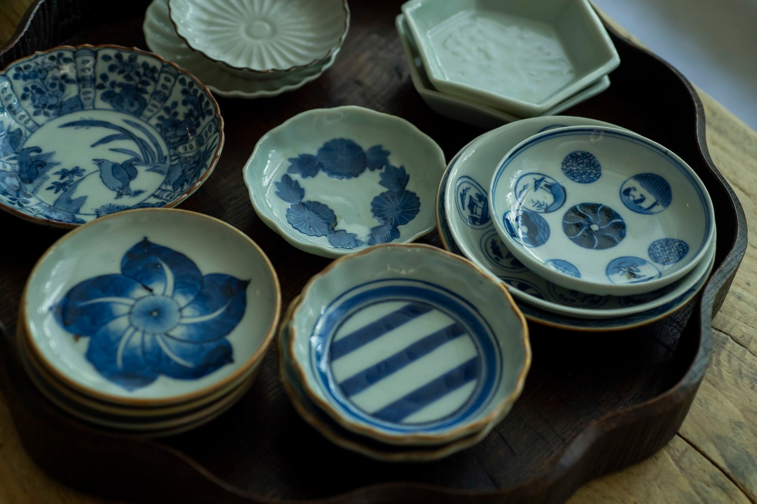 京都の観山堂でみつけた豆皿たち。薬味をいれたり、お醤油をいれたり。お客様がいらしたときにも大活躍します。木のお盆は落合芝地さんの作品。