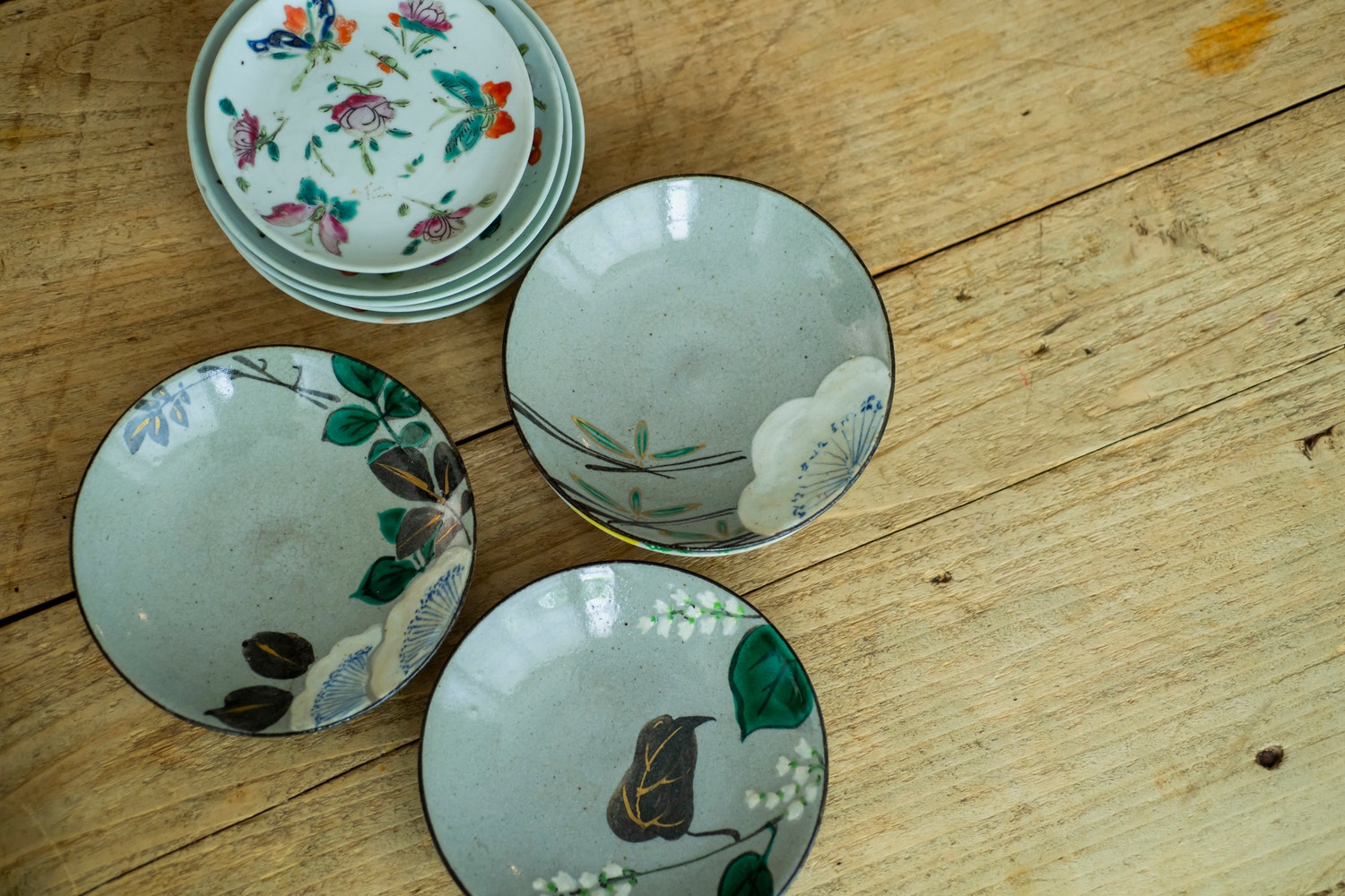 写真上は京都の友人が探してくれた銘々。下の3つは季節の花の絵柄がかわいい京焼。