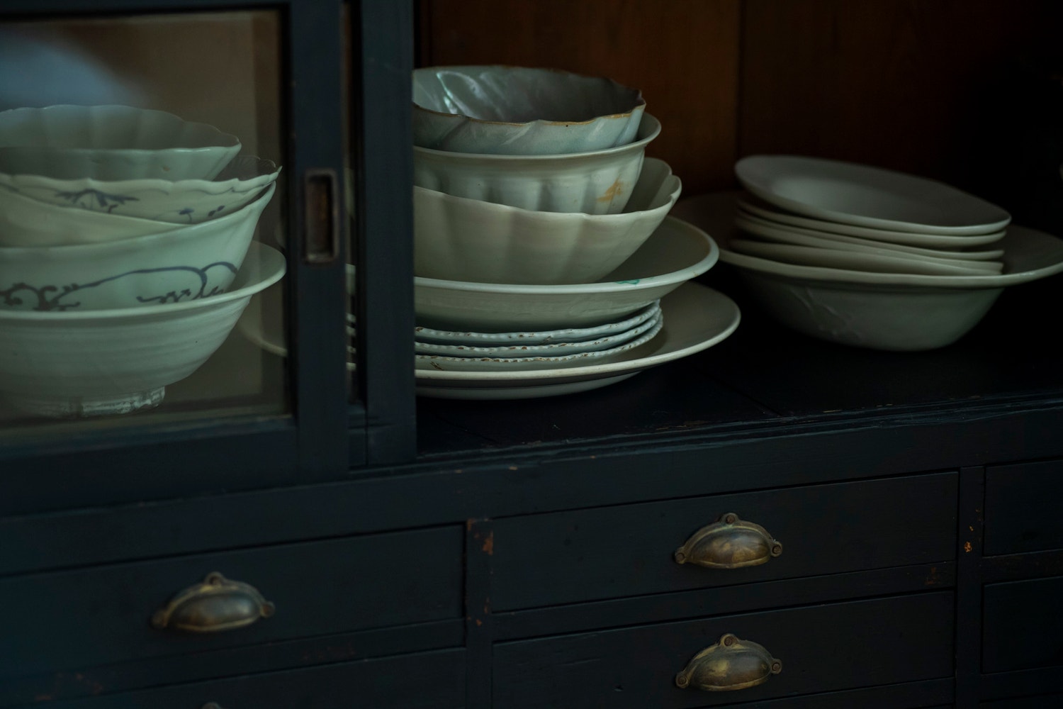 白い器がひときわ映える、小引き出しが並ぶ水屋箪笥