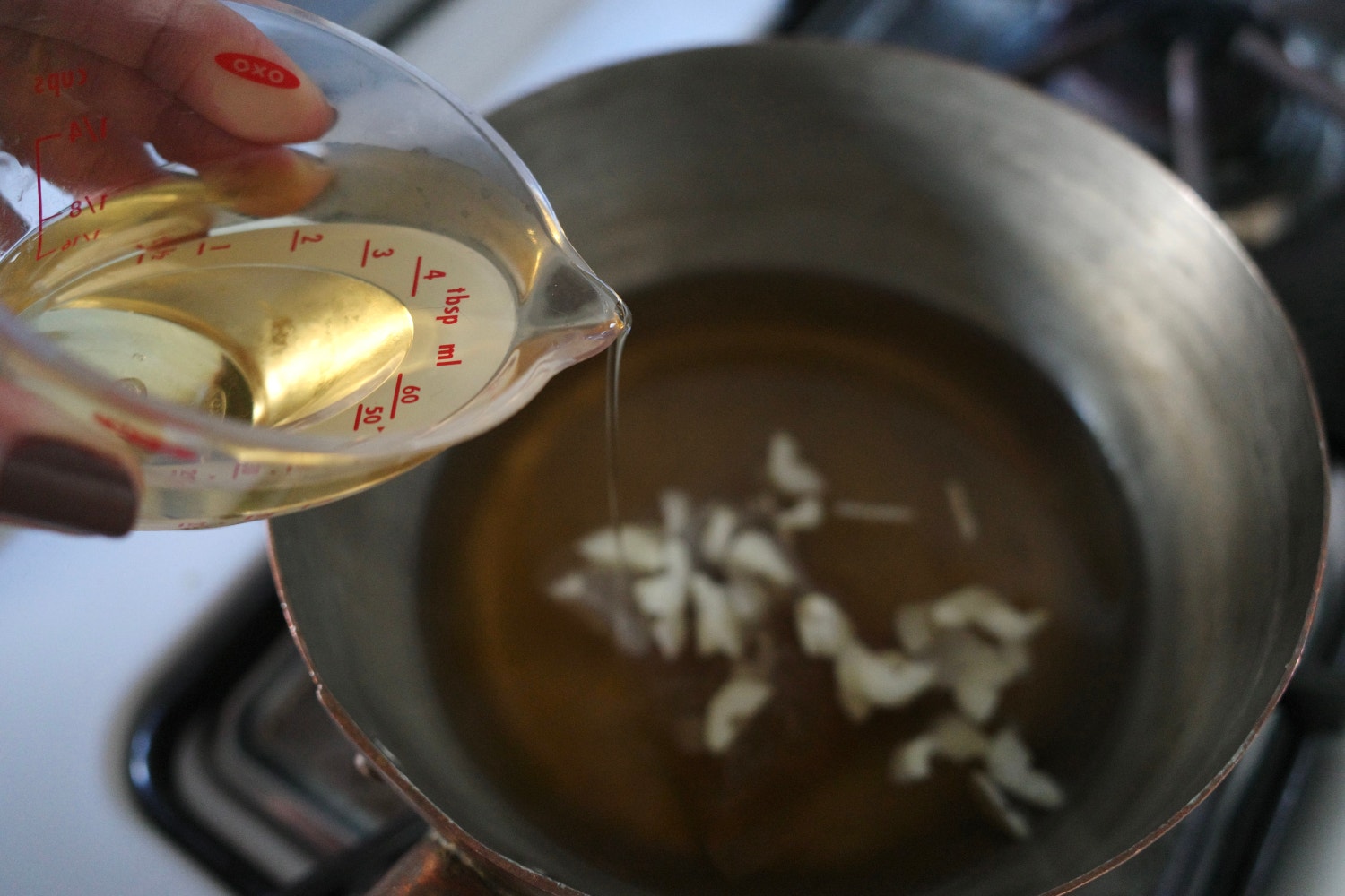 ①小鍋にだし汁、みりん、スライスしたにんにくを入れて火にかける。