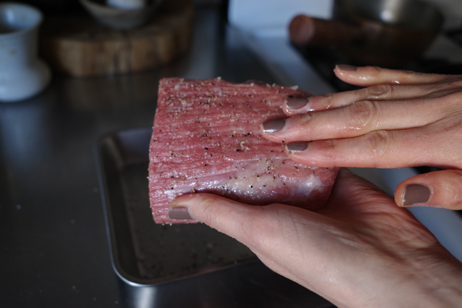 ③フライパンを中火で熱し、焼く直前に塩を肉全体に振る。手にオリーブオイルをとり、肉全体にしっかりなじませたら、全ての面を30秒ずつ焼いて焼き色をつける。
