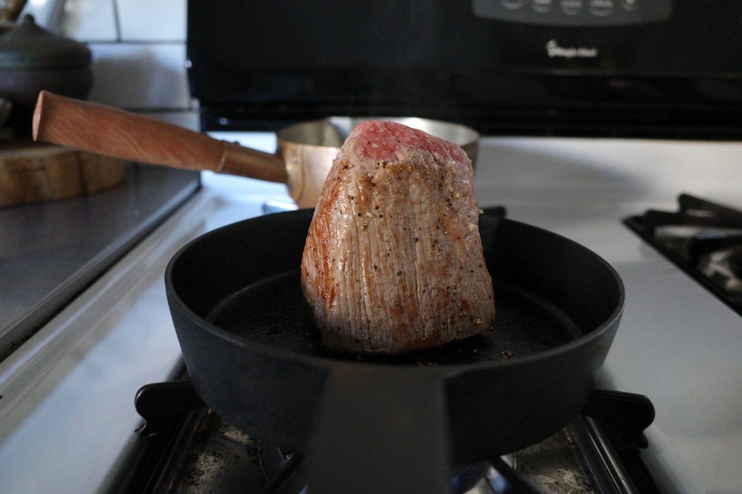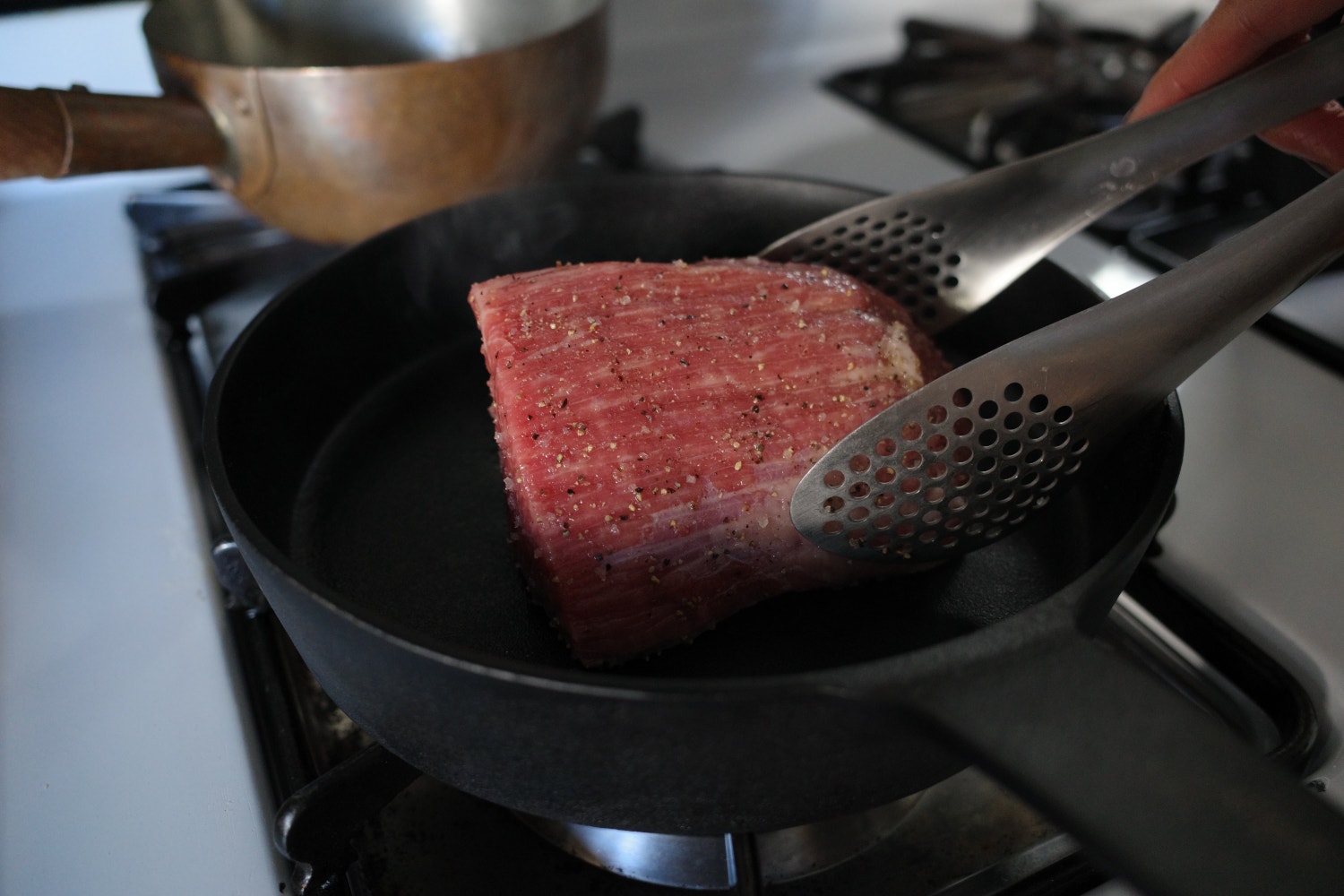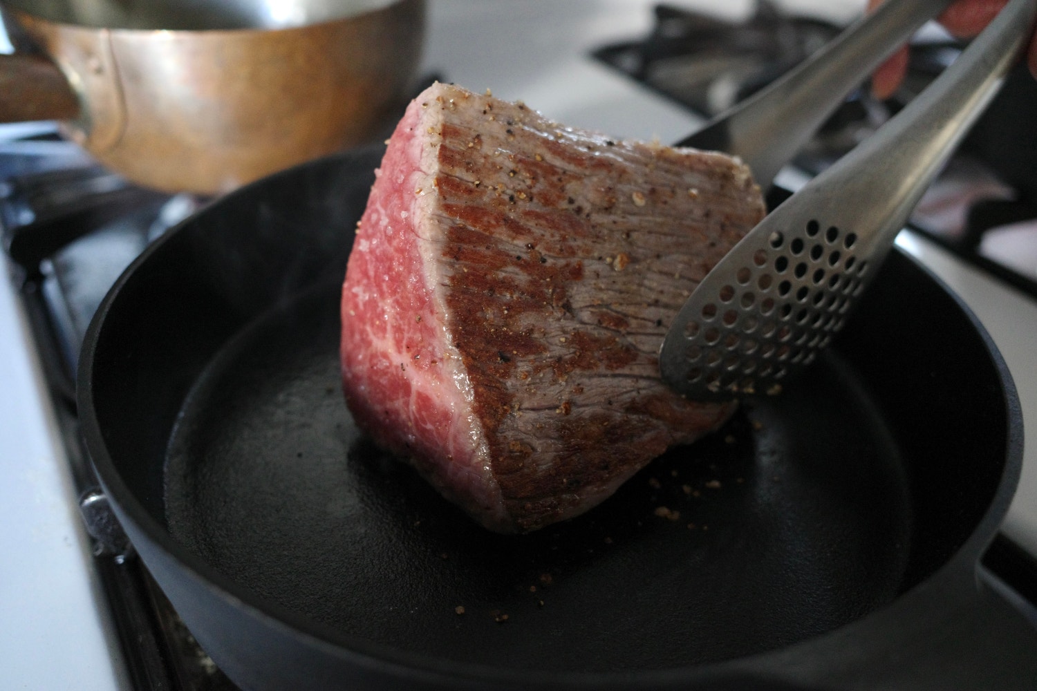 おいしくつくるポイントは①お肉を焼く前に常温に戻すこと。②鋳物の厚手のお鍋を使うこと。