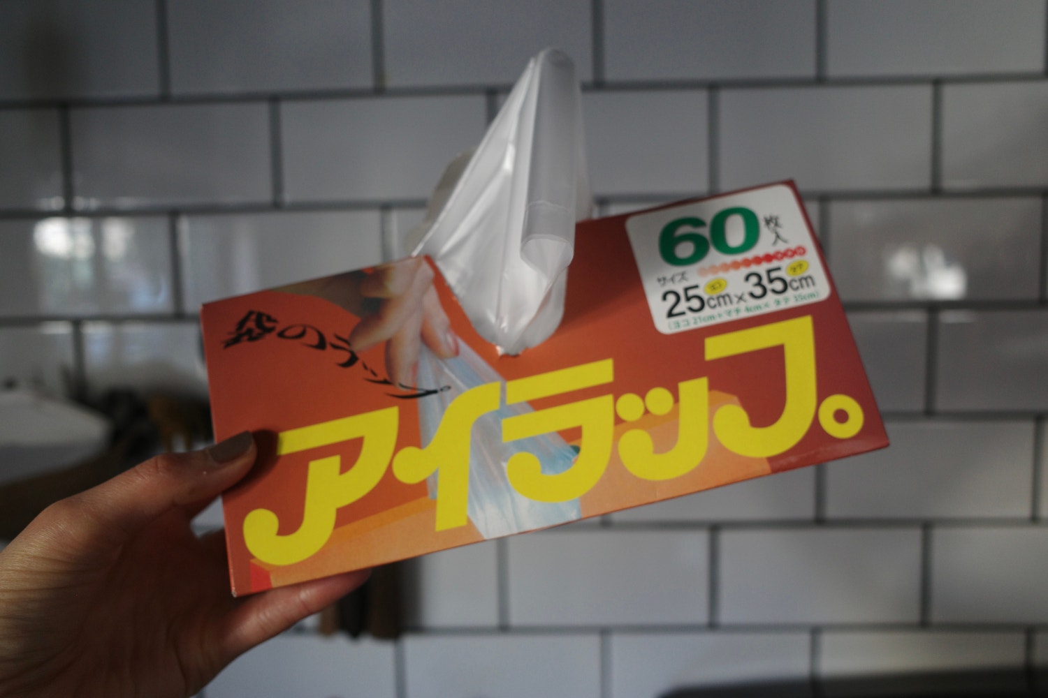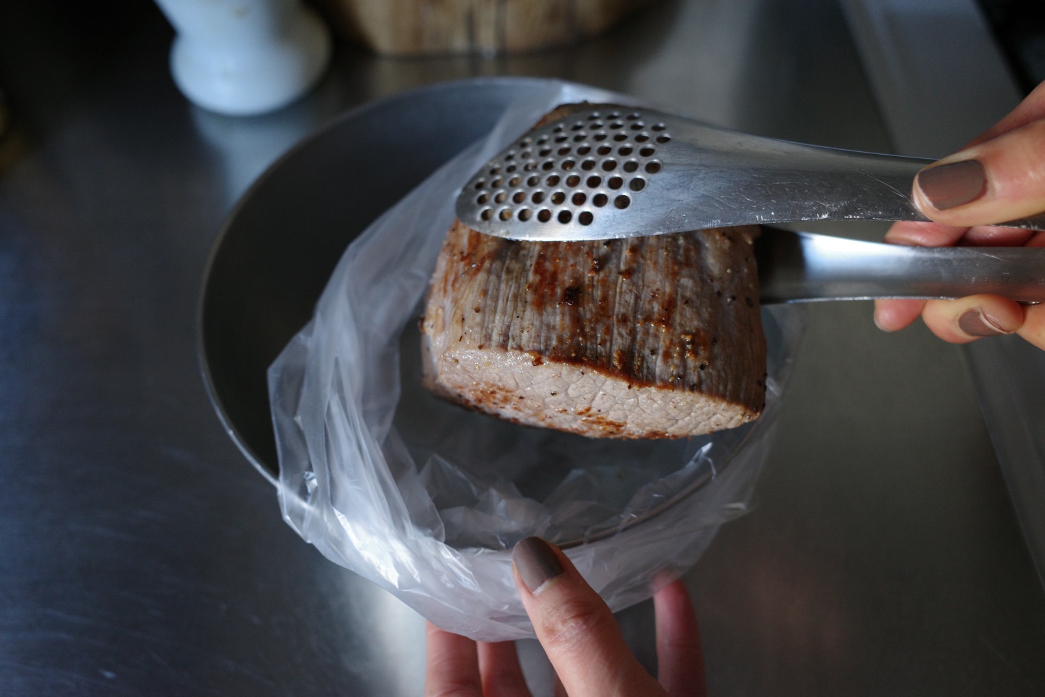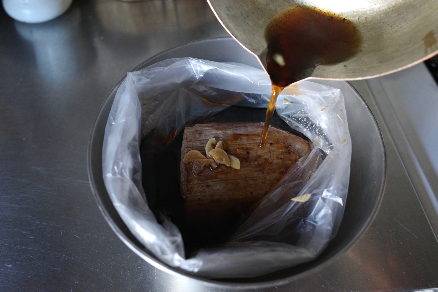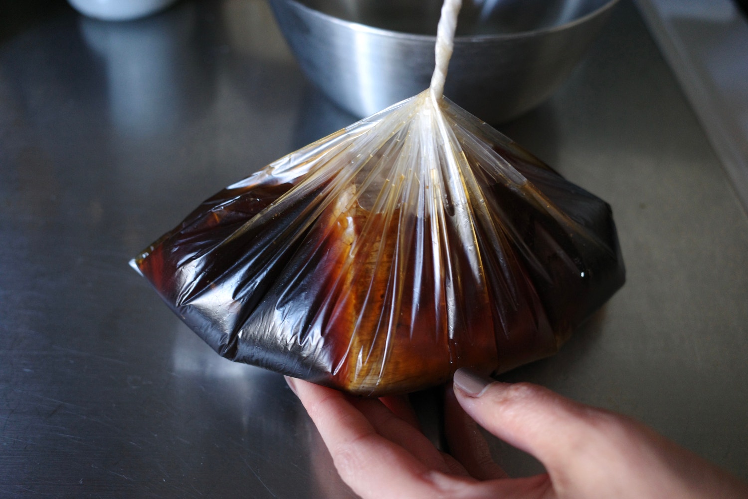④ビニール袋(今回はアイラップを使用)に焼いた肉を入れ、冷ましておいたつけだれを注ぐ。袋の空気をしっかり抜いて口を縛り、さらにもう1枚袋を重ねて二重にして封をする。
