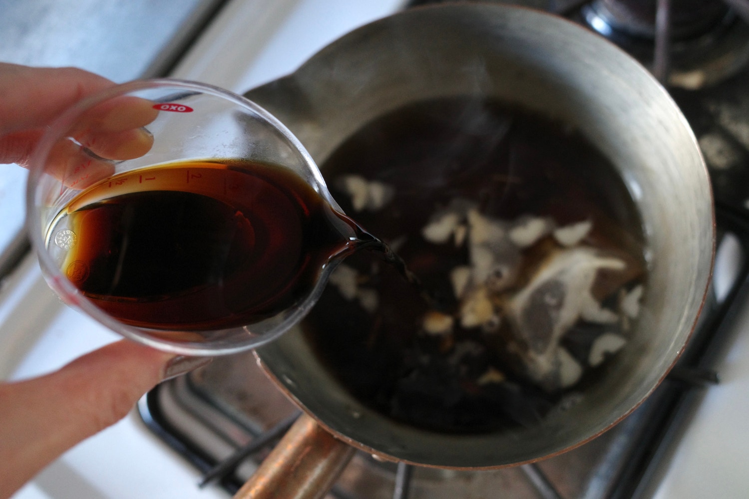 ②煮立ったらアルコールを飛ばし、醤油を加えてひと煮立ちさせたら火を止めて冷ましておく。